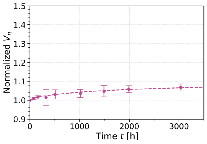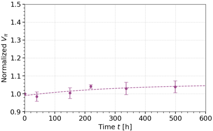 Long-term storage at 85°C provides an excellent way to demonstrate the ever-improving encapsulation technology. Among the different electrical and optical properties that are evaluated, the key metric for aging is the half-wave voltage Vπ, therefore only this one is discussed here.